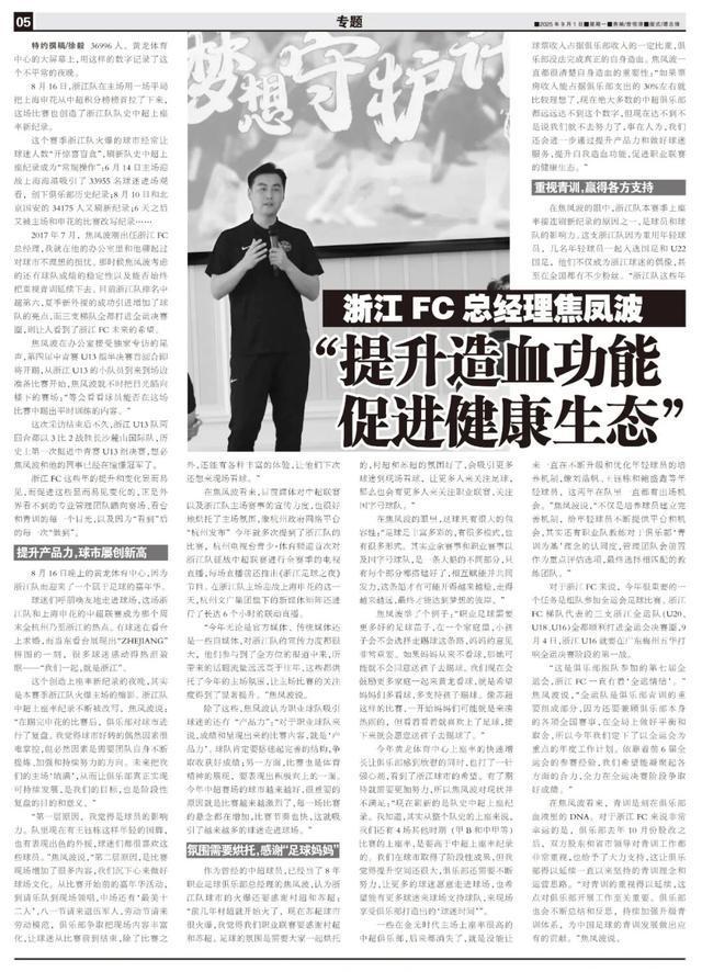 在焦凤波的眼中,浙江队本赛季上座率接连刷新纪录的原因之一,是球员和球队的影响力。这支浙江队因为重用年轻球员,几名年轻球员一起入选国足和U22国足,他们不仅成为浙江球迷的偶像,甚至在全国都有不少粉丝。“浙江队这些年来一直在不断升级和优化年轻球员的培养机制,像刘浩帆、王钰栋和鲍盛鑫等年轻球员,这两年在队里一直都有出场机会。”焦凤波说,“不仅是培养球员建立完善机制,给年轻球员不断提供平台和机会,其实还有职业队教练对于俱乐部‘青训为基’理念的认同度,管理团队会前置作为重点评估选项,最终选择相匹配的教练团队。”